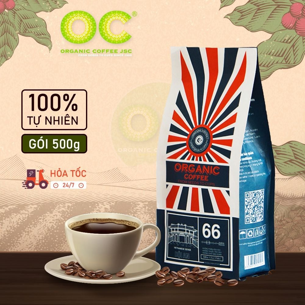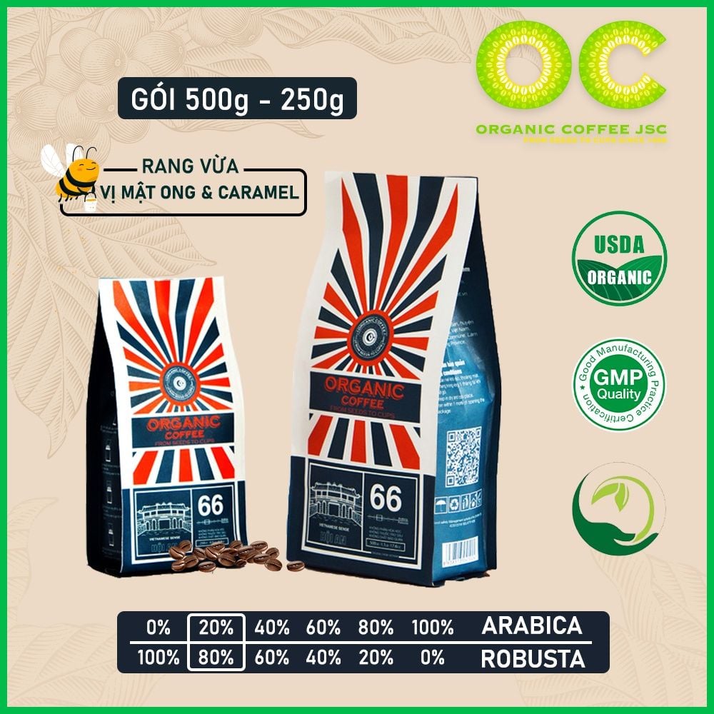 THÔNG TIN CHI TIẾT CÀ PHÊ RANG XAY NGUYÊN CHẤT ARABICA BLEND HỘI AN 66 - Thương hiệu: Organic Coffee JSC - Thành phần: 100% hạt cà phê hữu cơ với 60% Robusta và 40% Arabica - Phân loại: + Cà phê hạt và Cà phê bột + Rang vừa và Rang đậm + Pha phin và Pha máy - Khối lượng tịnh: gói 250g/500g - HSD: 24 tháng kể từ ngày sản xuất - Xuất xứ: Việt Nam