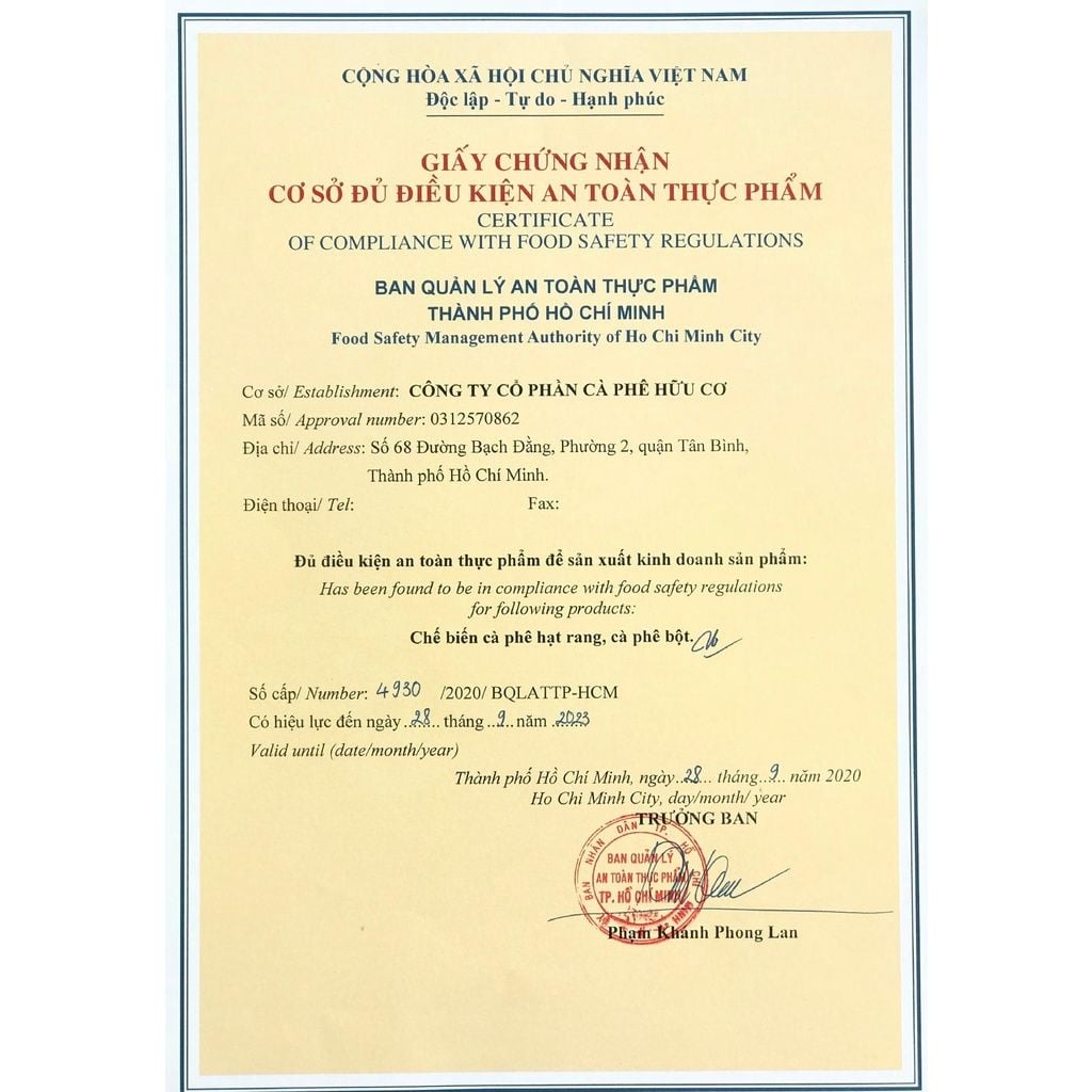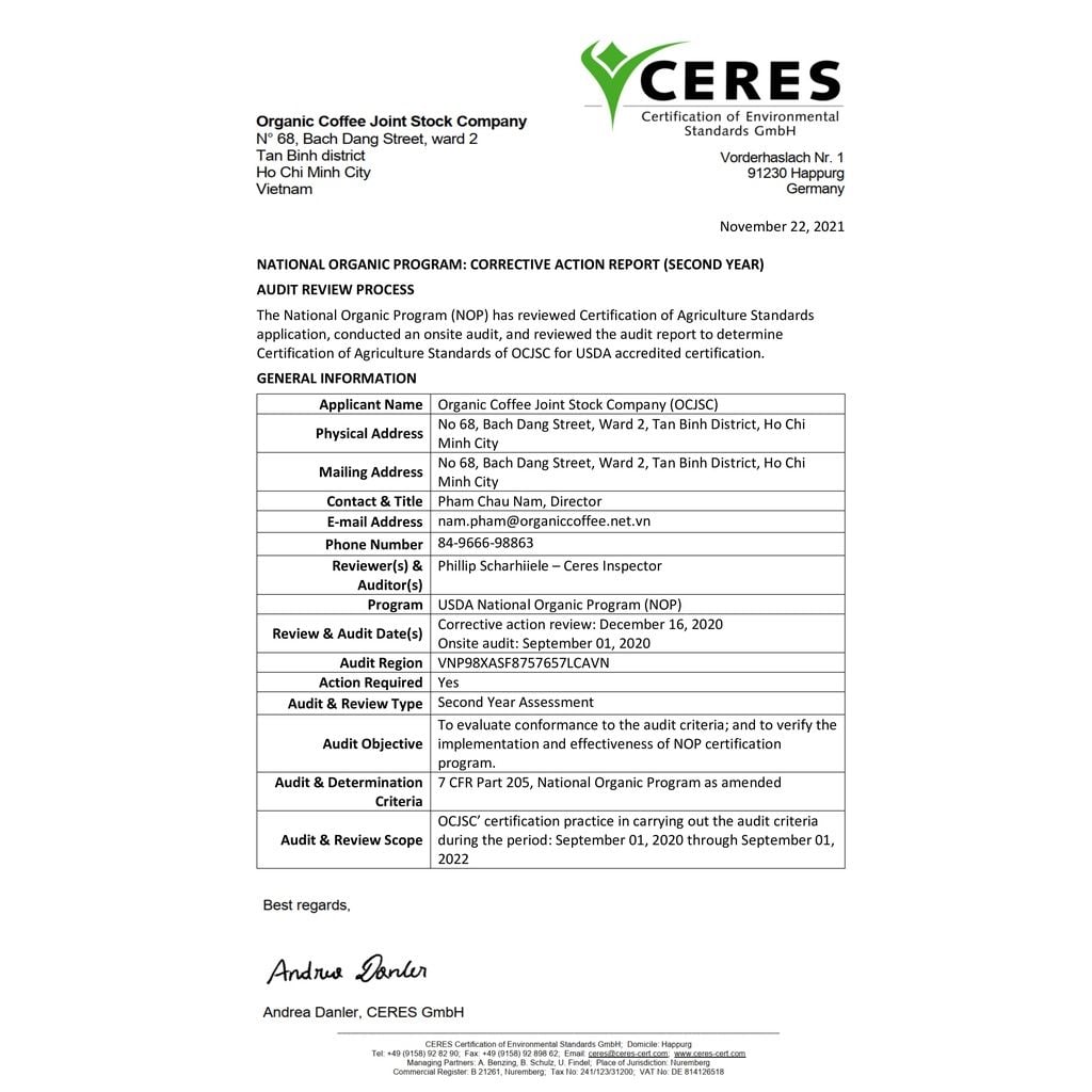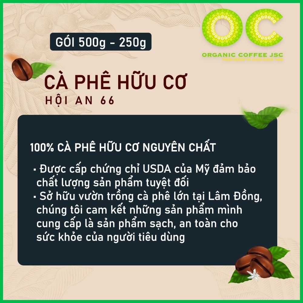 Organic Coffee JSC tự hào là thương hiệu cà phê hữu cơ Việt Nam duy nhất có chứng chỉ USDA. Sở hữu nông trại trồng cà phê được chứng nhận sử dụng phương pháp hữu cơ từ 2013. Đạt giấy chứng nhận Cơ sở vật chất đủ điều kiện an toàn thực phẩm để sản xuất kinh doanh sản phẩm cà phê. Khát vọng lớn nhất của cuộc đời là phổ biến cà phê sạch tới mọi người và giúp những người nông dân trồng cà phê cải thiện đời sống một cách bền vững. Vì vậy, khi bạn lựa chọn và tin dùng sản phẩm của Organic Coffee JSC. Bạn không chỉ giúp shop mà bạn cũng đang đóng góp 1 phần cho những người nông dân tại Tây Nguyên đó!