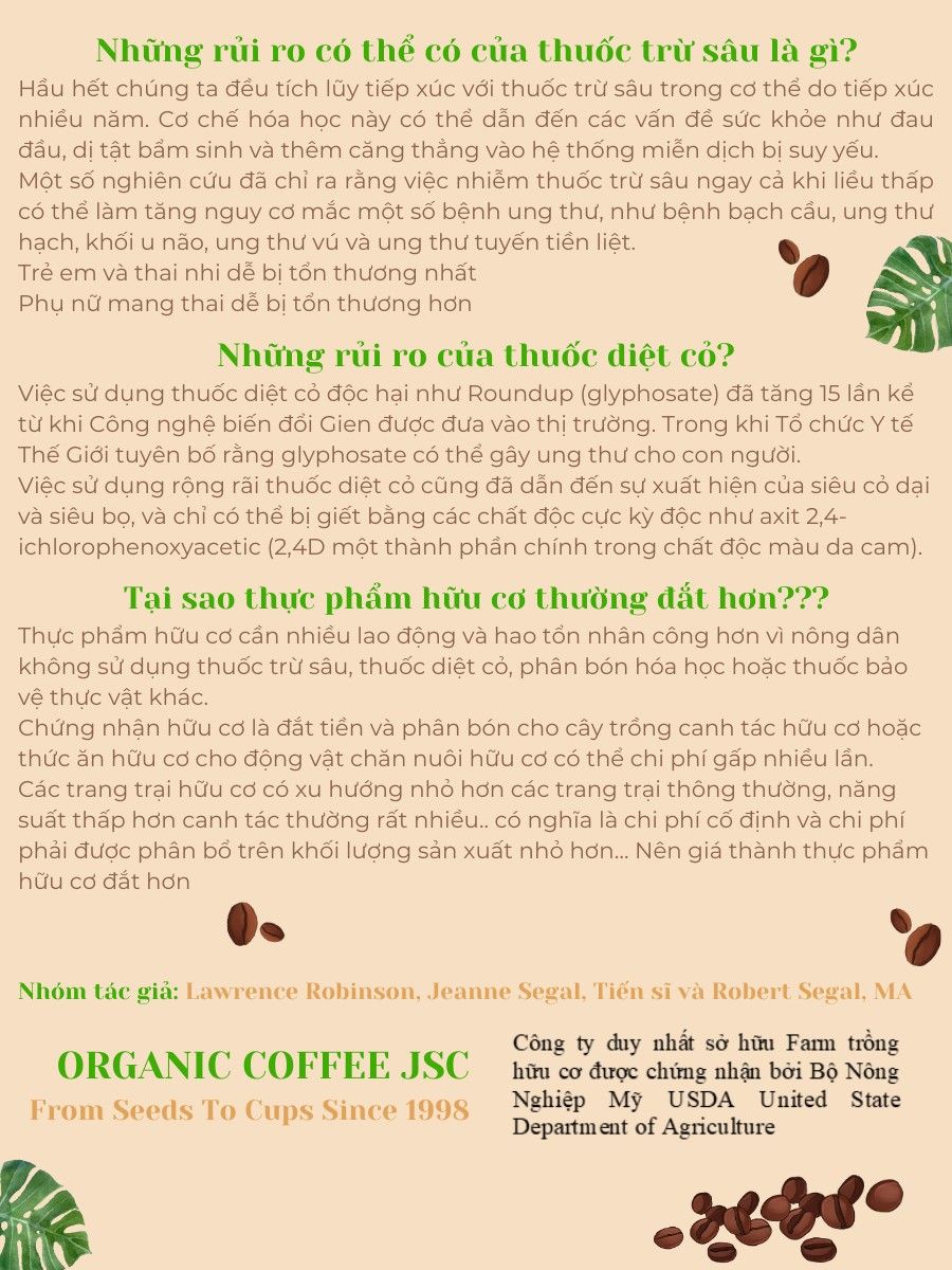 THÔNG TIN CHI TIẾT CÀ PHÊ HỮU CƠ THẢI ĐỘC ĐẠI TRÀNG ENEMA LOẠI PHỔ THÔNG - Thương hiệu: Organic Coffee JSC Tự hào là thương hiệu duy nhất đạt chứng nhận hữu cơ của Mỹ. - Thành phần: 100% hạt cà phê Robusta canh tác theo hướng hữu cơ - Không có chứng nhận Hữu cơ USDA của Mỹ. - Mức độ rang: Rang nâu (Light Roast) - Khối lượng tịnh: + 250Gr gồm 18 Túi lọc lớn 14Gr + 453Gr gồm 30 Túi lọc lớn 14Gr + Túi lọc thiết kế MỚI hòan toàn + Giấy Lọc đạt chuẩn Châu Âu: Hạn chế tối đa các chất độc_hại (Cadimi) và kim loại_nặng (Chì - Thuỷ ngân) gây_hại lâu dài cho cơ thể. Các chất_này thường tồn đọng khá cao trong giấy lọc trà/cà phê trôi nổi, không rõ xuất_sứ.. trên thị trường. - HSD: 24 tháng kể từ ngày sản xuất - Xuất xứ sản phẩm: Việt Nam ĐẶC ĐIỂM CÔNG DỤNG CỦA SẢN PHẨM TÁO_BÓN - NGUY_CƠ_ĐƯỜNG_RUỘT VÀ GIẢI PHÁP_TRỊ_LIỆU... Liệu pháp Gerson. Max Gerson (1881 - 1959) là một bs người Mỹ gốc Đức, người đã phát triển phương pháp thải_độc đại_tràng bằng thụt_cà phê hữu cơ ORGANIC COFFEE, được gọi là liệu_pháp Gerson (Gerson Therapy). Thải_độc bằng thụt cà phê hữu cơ ORGANIC COFFEE là một phần rất quan trọng trong trị _liệu_ung_thư của Tiến sĩ Gerson được áp dụng từ 1938. Thụt là kỹ thuật đưa một ống_nhỏ vào trực_tràng thông qua h_môn và các chất_lỏng như cà phê hữu cơ đã đun và lọc chảy thẳng vaò_ruột_già. Trong cà phê hữu cơ chứa chất Cafeine – Theophylline - chất Tannis có thể tiêu_diệt_vi_khuẩn gây_hại trong đại_trực_tràng, đồng thời có tác dụng_kích_thích nhu_động đường_ruột giản_nở_mạch_máu thành_ruột và giảm chứng_viêm_ruột. Khi cà phê được giữ lại trong_ruột, đi qua thành_ruột, thông qua các_tĩnh_mạch đi về_gan, chất Tannis thúc_đẩy ống dẫn_mật mở ra và_kích_thích_gan tiết_ra_enzyme Glutathione-S-Transferase (GST) là chất_giải_độc bậc thầy trong cơ thể chúng ta. Cách thải_độc_đại_tràng bằng cà phê: Chúng ta sẽ không dùng cà phê theo cách uống thông thường mà sẽ dùng cà phê thông qua đường đại_trực_tràng. Bởi nếu như theo cách uống thông thường, cà phê sẽ đi qua_dạ_dày và đường_ruột_trước, chất Tannis trong cà phê sẽ kích_thích_dạ_dày và bị_phá_hủy khi đi qua ruột_non. - Organic Coffee JSC tự hào là thương hiệu cà phê hữu cơ Việt Nam duy nhất có chứng chỉ USDA. - Cà phê hữu cơ thải độc đại tràng Enema giúp ngừa táo bón, làm sạch đường ruột, thải độc gan mật. - Cà phê rang nâu có mùi thơm cà phê nhẹ, hợp với nhiều loại cơ địa, dược tính vừa phải. - Giúp ngủ ngon, giảm cân và mở thừa, trắng sáng da, ngăn ngừa ung_thư. *Lưu ý: Sản phẩm này không phải là thuốc và không có tác dụng thay thế thuốc chữa bệnh, kết hợp chế ăn điều độ và rèn luyện sức khoẻ!” HƯỚNG DẪN SỬ DỤNG Vui lòng xem video. BẢO QUẢN: nơi khô ráo, thoáng mát. Sản phẩm dùng tốt nhất sau khi mở bao bì 01 tháng. CAM KẾT VỚI KHÁCH HÀNG: SP được kiểm tra kĩ càng và tư vấn nhiệt tình trước khi giao hàng. #cafethaidoc #cafegerson #thaidocdaitrang #caphehuuco #gersoncoffe #thaidocgerson #caphegerson #caphethaidocdaitrang #thutthaodaitrang #thutthaocaphe #enema #thaidocgan #dungcuthut